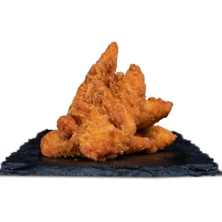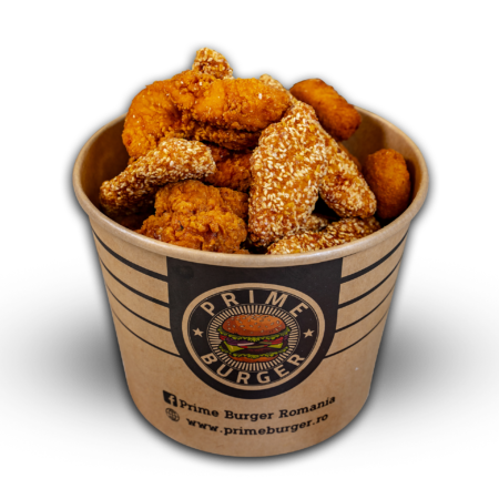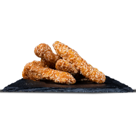 spicy strips de pui (240g), aripioare de pui crocante (240g) + la alegere Fingers cu susan de pui (300g) sau Nuggets de pui (300g)